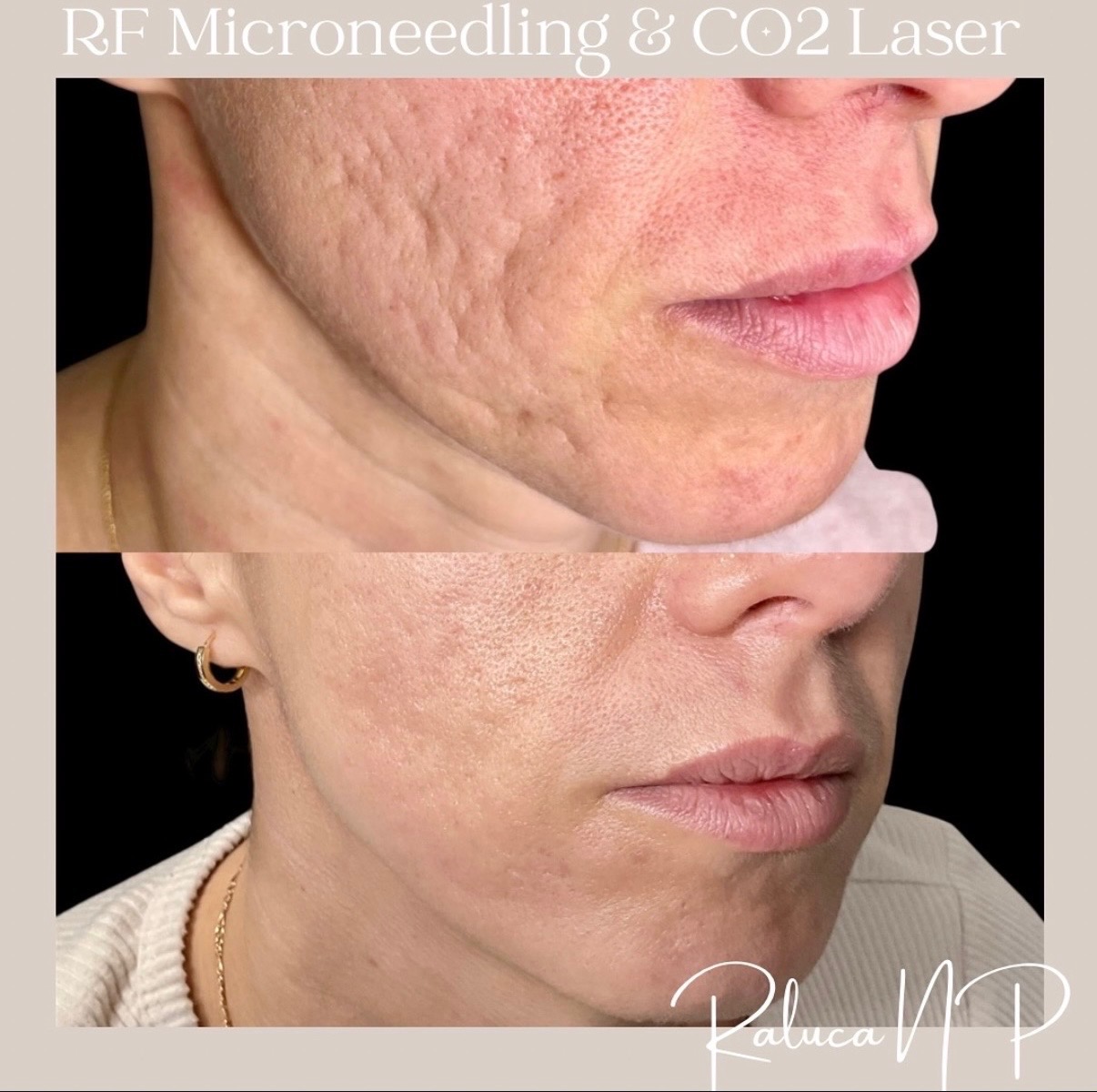 Radiofrequency microneedling stimulates the production of elastin and collagen to refresh the skin and improve tone and texture.